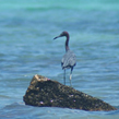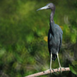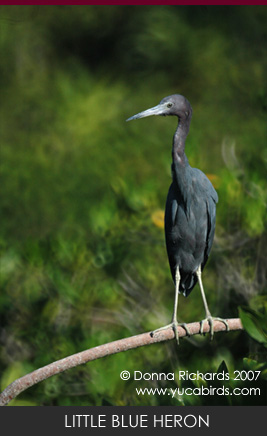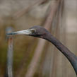 medium heron; dark blue (purplish) neck, blue body; blue or grey bill with blackish tip; juveniles are white and gradually change color as they mature