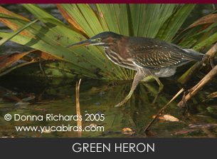 smallish heron; greenish-black cap; greyish wings w/ greenish blue tinge; chestnut neck; throat white, streaked with brown; black w/ orange bill; yellow or orange legs and feet; juvenile has white spots on back/wings