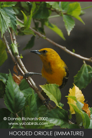 orange head, black face/throat; black wings with white bars; juvenile not as orange as male and lacks the same amount of black on face; female more yellowish in color, dull brown wings |