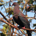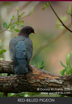 dark maroon pigeon; back darker than head, bill white/red at base, red legs |