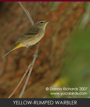 winter male has streaked black/slate back with yellow rump; female dull brown with streaked front and back and yellow rump; "Audubon's" has yellow throat |